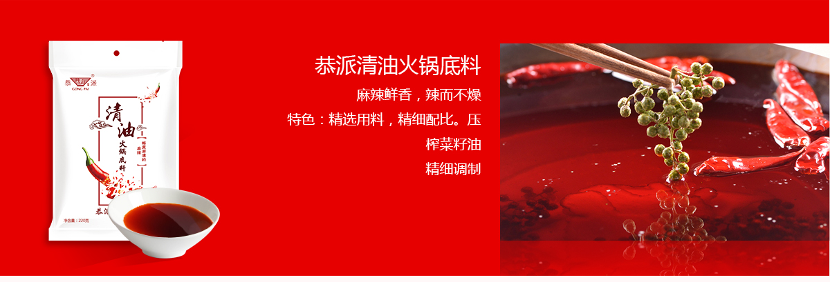 恭派调料是四川德阳恭众餐饮有限公司研发监制的系列产品,其“麻辣鲜香”的复合型特点深受全国消费者的喜爱。恭众餐饮本着:“踏实做人、诚实做事”的经营理念选上等食材、调精细味道,以传统改良配方结合现代工艺保证产品的安全和正宗,让消费者放心满意。